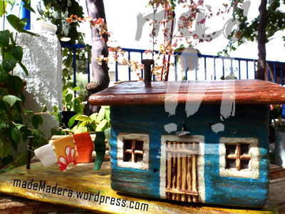 Esta casita es especial, porque es la primera que hicimos y le tenemos mucho cariño. Nos encantan las maderas recicladas. Está hecha con un taco de palet, maderas viejas varias, alambre, clavos y tela. Pintada con tintes y barnizada.