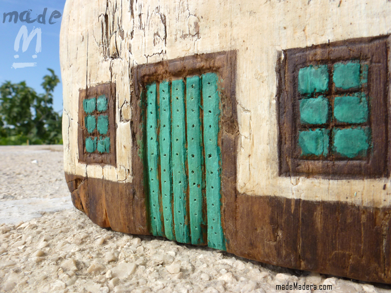 Está pintada a mano, hecha de madera vieja reciclada con preciosas grietas, cartón encolado para el tejado y clavo para la chimenea. 🙂