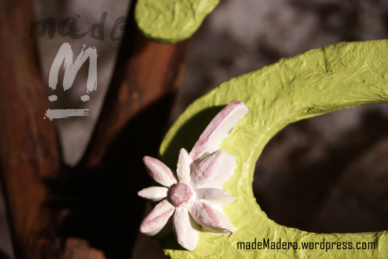 La «letra V» es un trozo de rama seca de una de las mimbres de la orilla del pantano. Las vocales son paneles de madera cortados con la sierra de calar y decorados muy cuidadosamente con servilletas de papel arrugadas y encoladas. «El tacto es increíble». La madera vieja en la que se apoyan las letras es de pino y hemos atravesado un palo para colgar los enganchitos de alambre. Luego lo hemos pintado, barnizado, colgado y fotografíado directamente desde el corazón.