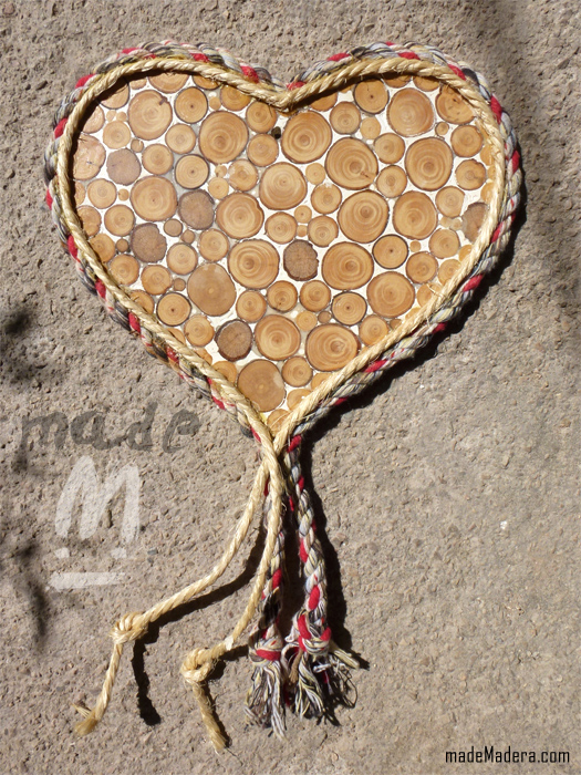 Corazón hecho sobre madera reciclada recubierto con rodajitas de madera de diferentes tamaños. Contorneado con cuerdas.