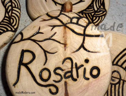 Personaliza tus rodajas rústicas con el nombre que quieras. Para usarlas como colgantes, llaveros o lo que se te ocurra. Madera de ciprés. Pirograbado a mano.