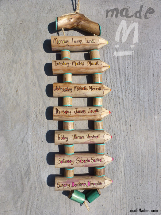 Esta semana ha sido «La vuelta al Cole». No nos hemos podido olvidar de cuántos niños habrán vuelto a coger un lápiz después de estos meses de verano de locura y diversión. Por eso, hemos querido homenagearlos con este exclusivo diseño de Semanario Educativo Rústico Desmontable, para que aprendan sin esfuerzo los días de la semana en tres idiomas diferentes.