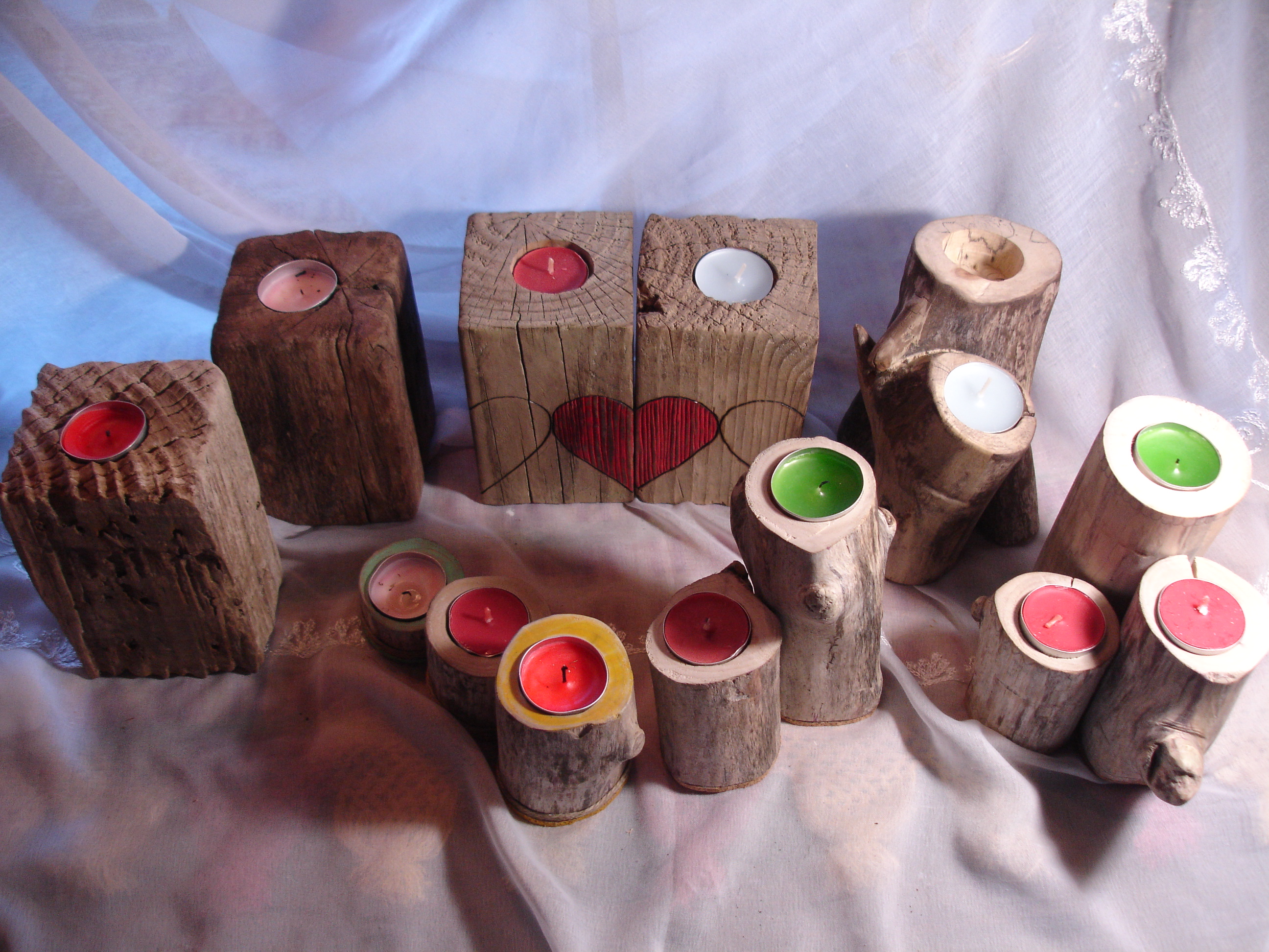 No he inventado nada, solo os presento una variedad de porta velas; fáciles de hacer, simples, económicos y muy decorativos. Hay dos modelos hechos con los tacos de los palets y los otros como podéis ver, son trozos de ramas gruesas encontradas en la orilla de un embalse. Están pegados y sobre una base de corcho para no rayar la mesa donde se coloquen. El que está pirograbado, al girar forma un corazón diferente.